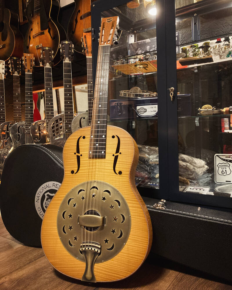 National’s 14-Fret Style “O” became an icon when Mark Knopfler began using a late 1930s model and pictured it prominently on the cover of Dire Straits’ Brothers in Arms album released in 1985. Our reproduction is true to the vintage original. The smaller, 14-fret body allows versatility and ease of access for reaching those higher notes. The brass-bodied instrument is polished to a mirror-like shine, nickel plated, and then etched with the exotic Hawaiian palm-tree scenes. The maple neck is finished in a traditional sunburst. An ivoroid-bound ebony fretboard and vintage-style engraved tuners complete the look of this enduring classic.