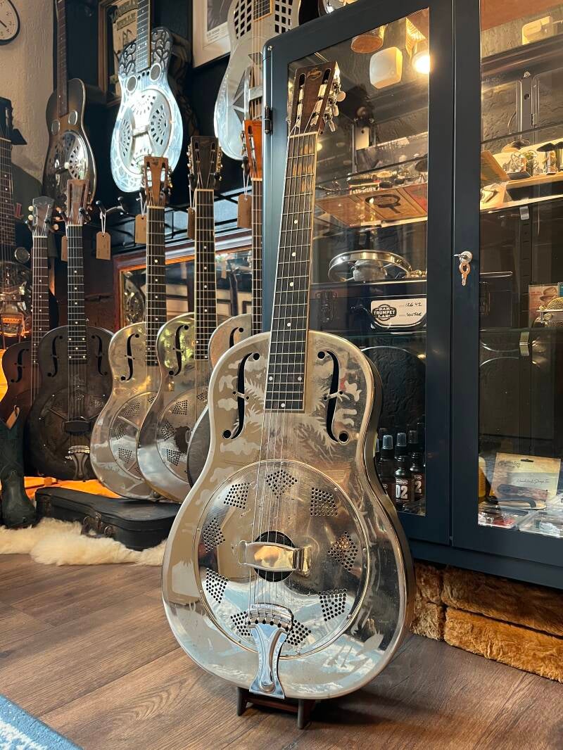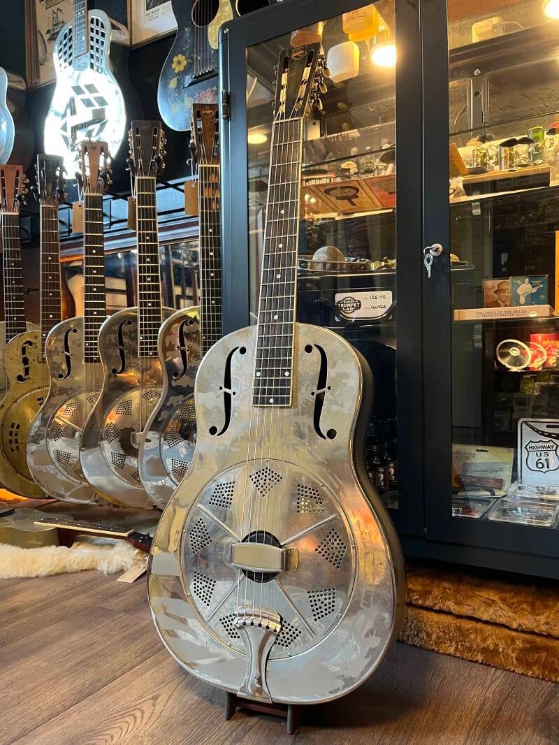 As a resonator shop we do our best to offer you the highest quality instruments available! We have brands like National, Dobro, Leewald and of course vintage! The problem with resonator guitars is that most of the time they are expensive or otherwise low quality. Of course you can get a good instrument that’s made in China, but you have to be a bit lucky. Well, you can be! One of the leading “made in China” brands at this moment is Royall. A fairly small company with a strong desire to make good instruments. With a bit of help they are reaching the so called “mid level” range for players with a budget, or for the ones who are in need of a good traveling instrument next to their high end guitars. We as Mainwood Guitars have the access and possibility to “hand select” these Royalls and do the final setup here at the shop. In these way you can be sure that you’ll get a good instrument with an excellent quality control. Of course they are not on the same level as the high ends, but a very, very good option for a small budget!
