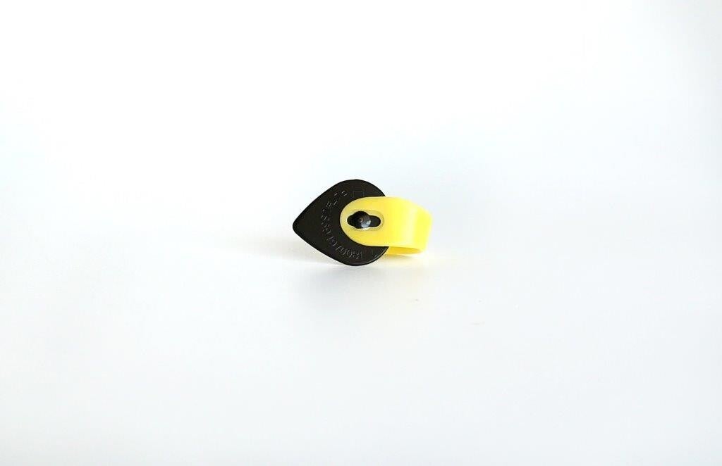 The Bumblebee is a unique combo of a flat pick and thumb pick all rolled into one! It is fully adjustable and rotational which makes it user-friendly and adaptable to your individual playing style. Adjust the amount of blade striking the string and set the angle of attack as you prefer. Switch from thumb picking to flat picking without changing picks! Unlike the rigid feel of solid one piece thumbpicks, the BUMBLEBEE is assembled in two pieces and allows flexibility as you pick- it really does feel like having a flatpick in your hand. Just choose a BUMBLEBEE in whatever gauge and blade style you use for a flatpick and sting the strings! Made of Delrin, it provides a soft and natural sound on the strings. The Bumblebee comes in two shapes: Jazz and Teardrop. The Jazz is pointed more like a regular flat pick and is favored by players in transition between thumb and flat picking. The Teardrop has a more rounded, less aggressive point. Choose from regular or large thumb hole and right or left handed models! Bumblebees are made in light, medium, heavy and X-heavy.